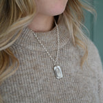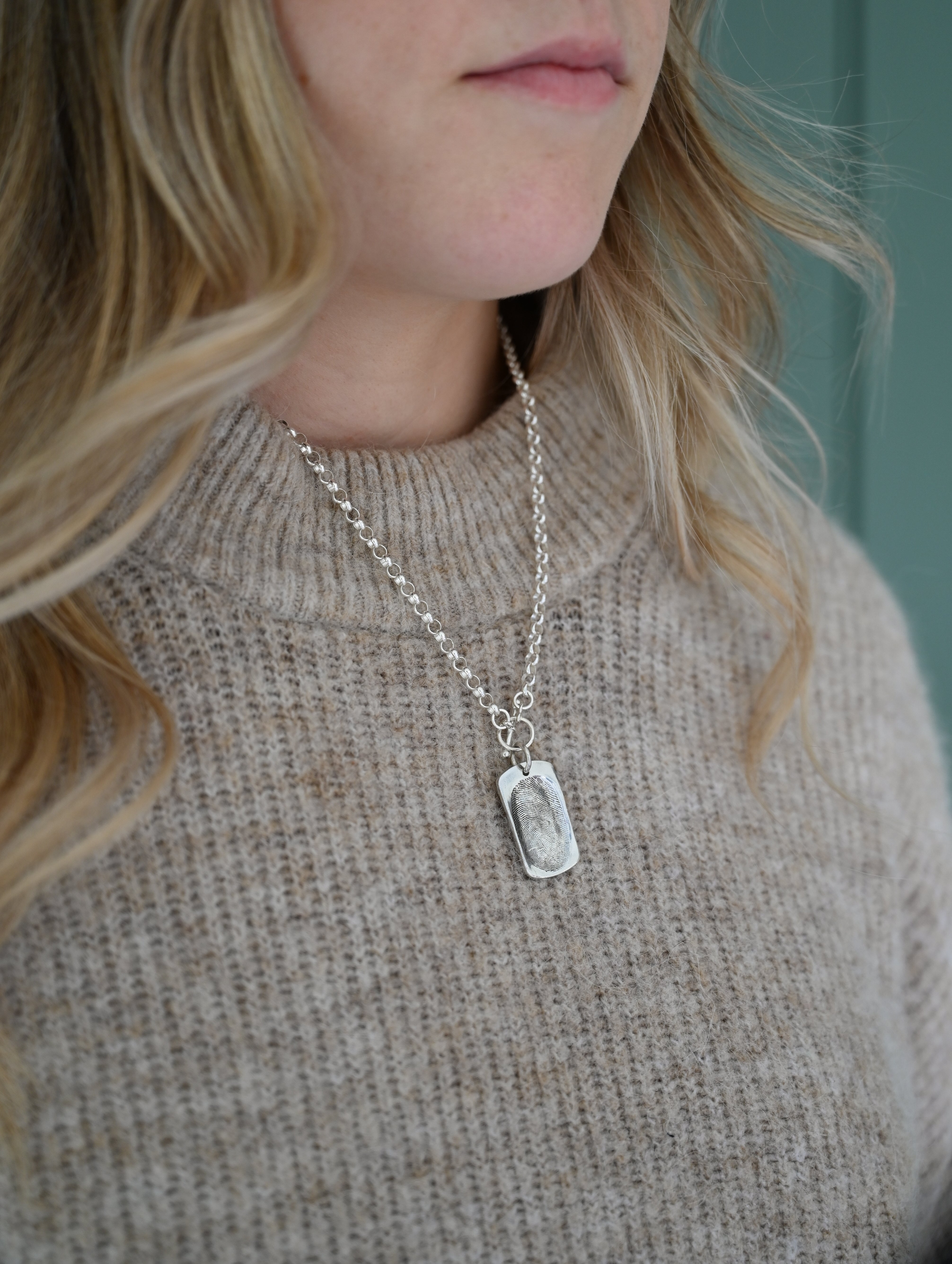 To keep your jewellery looking its best, use the polishing cloth provided with your piece to remove any light tarnish. For more stubborn tarnish, gently polish with a silver polish. Chains can be cleaned using a silver dip, which is available at most hardware stores—this process is quick and will leave them looking sparkly and new. However, avoid dipping any engraved or printed pieces, as this could remove the antiquing from the print or engraving. Always store your jewellery in a cool, dry place when not in use to maintain its shine and quality.