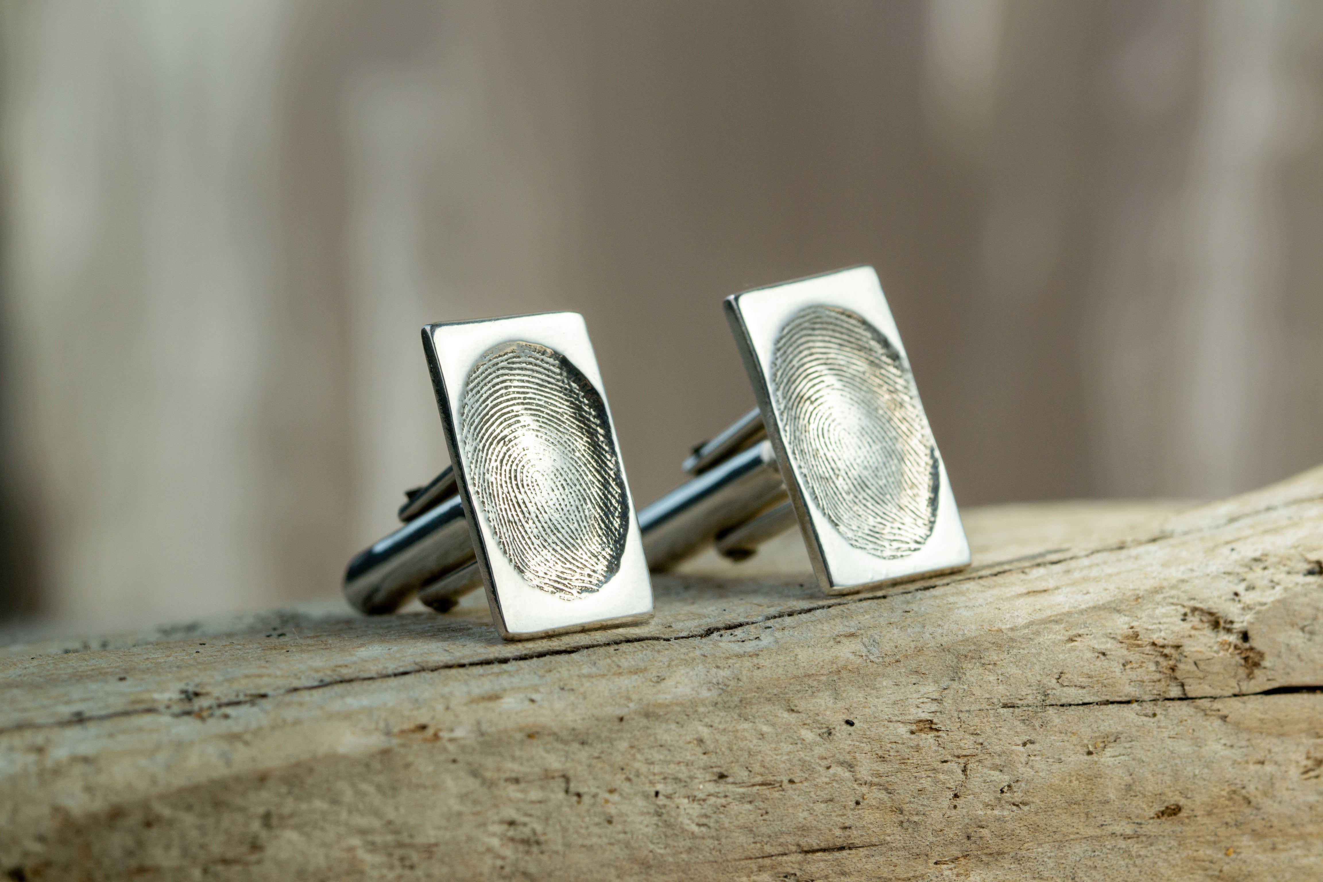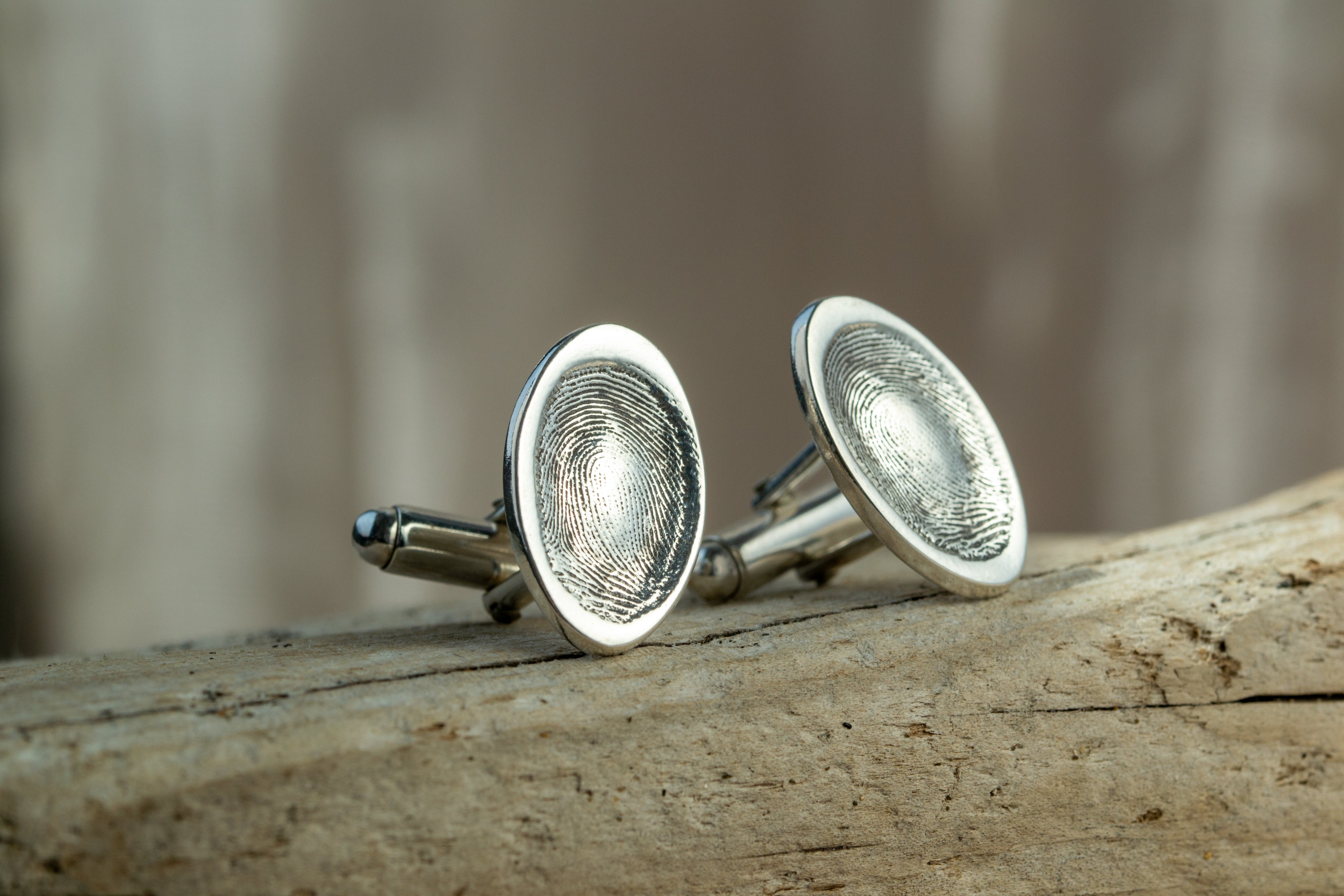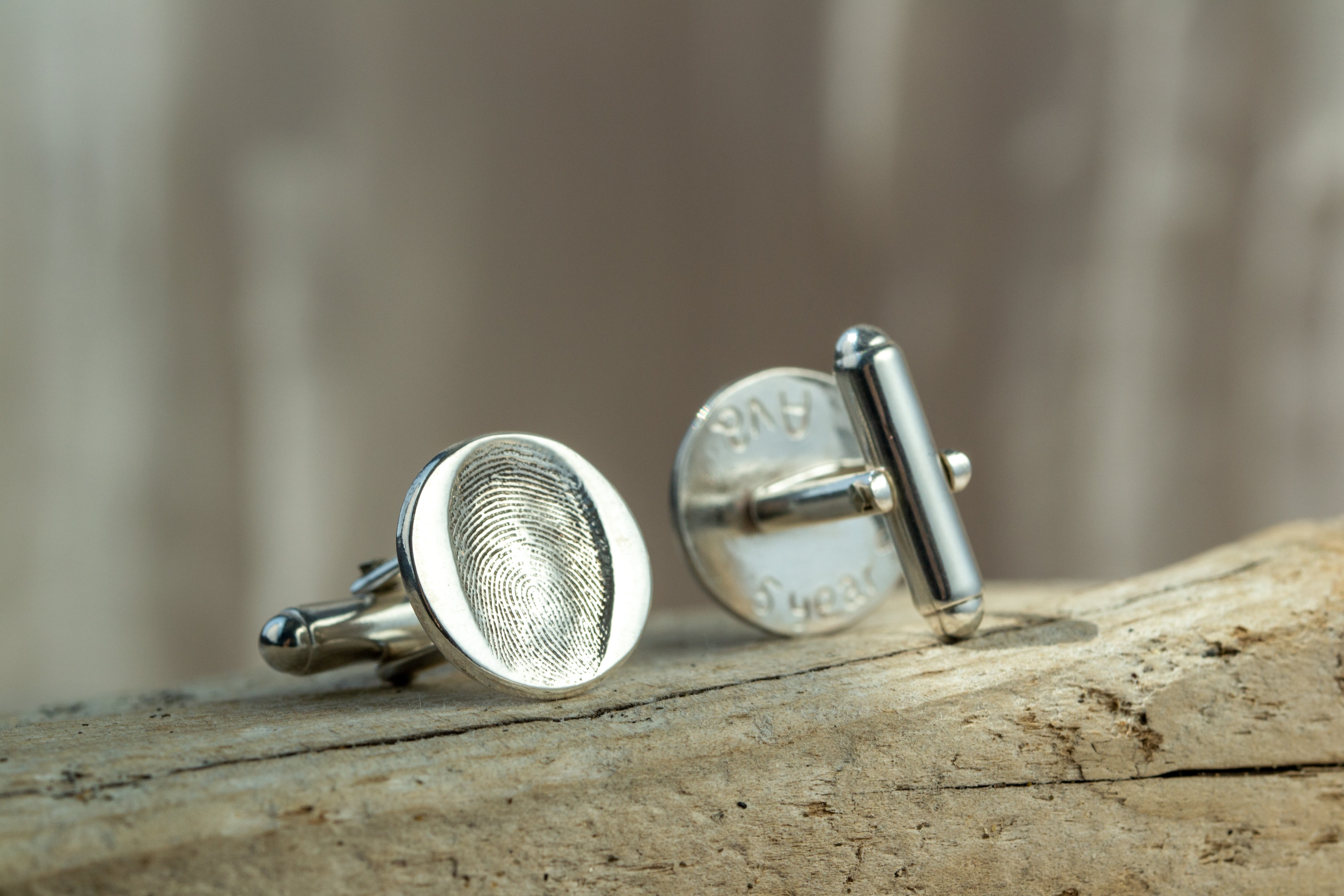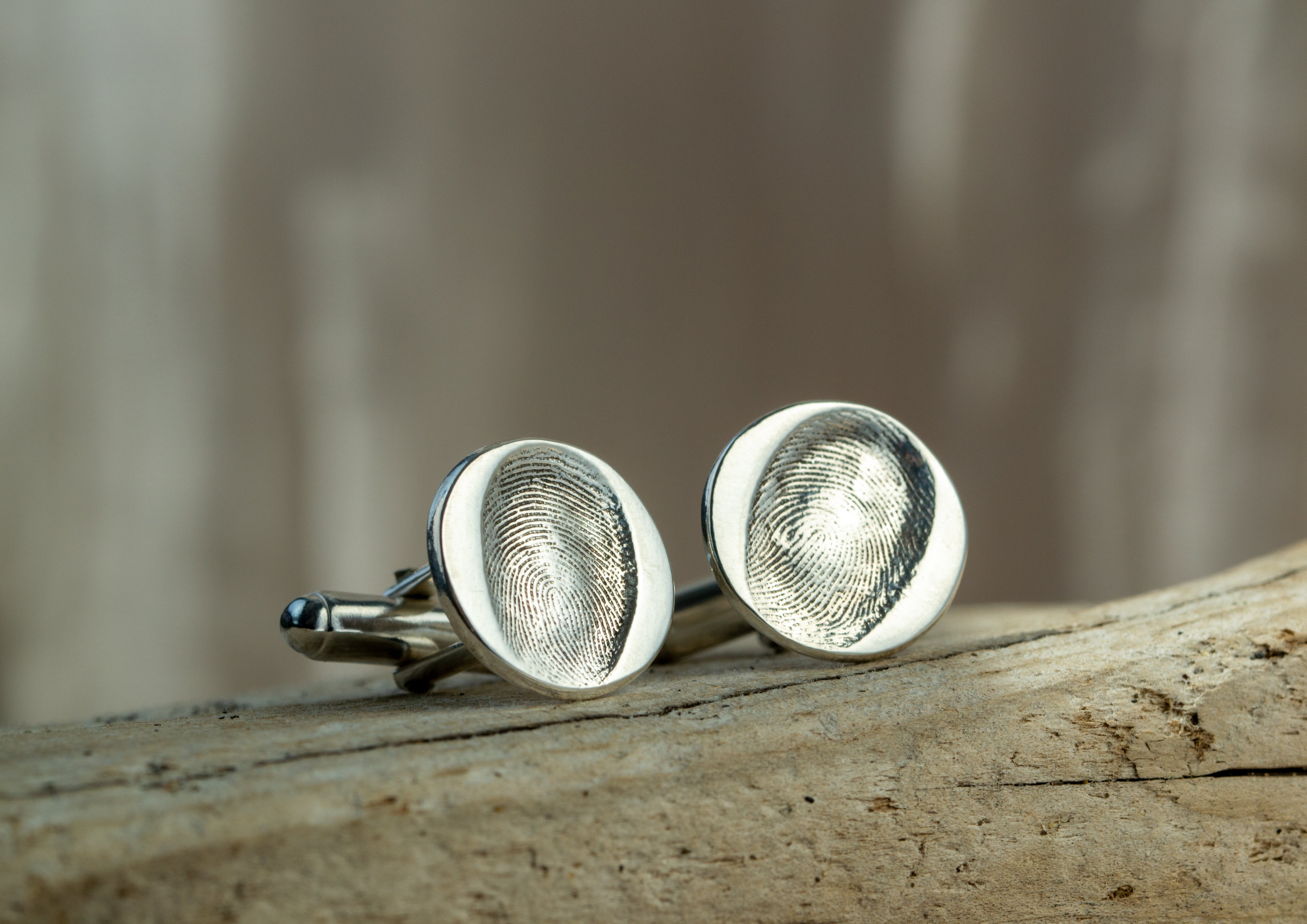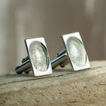 Кръглото копче за ръкавели е класическа проста форма, за да покаже действителния пръстов отпечатък на вашето бебе, заснет в стерлингово сребро. И също толкова ефективен с пораснал (сватбен подарък, някой?)! Ако имате бижутер във вашия район , можете да се срещнете с него, за да направи отпечатъка директно върху произведението. Като алтернатива можете да включите комплект смес за формоване към поръчката си, за да вземете свой собствен отпечатък, от който ще направим перфектния комплект копчета за ръкавели.