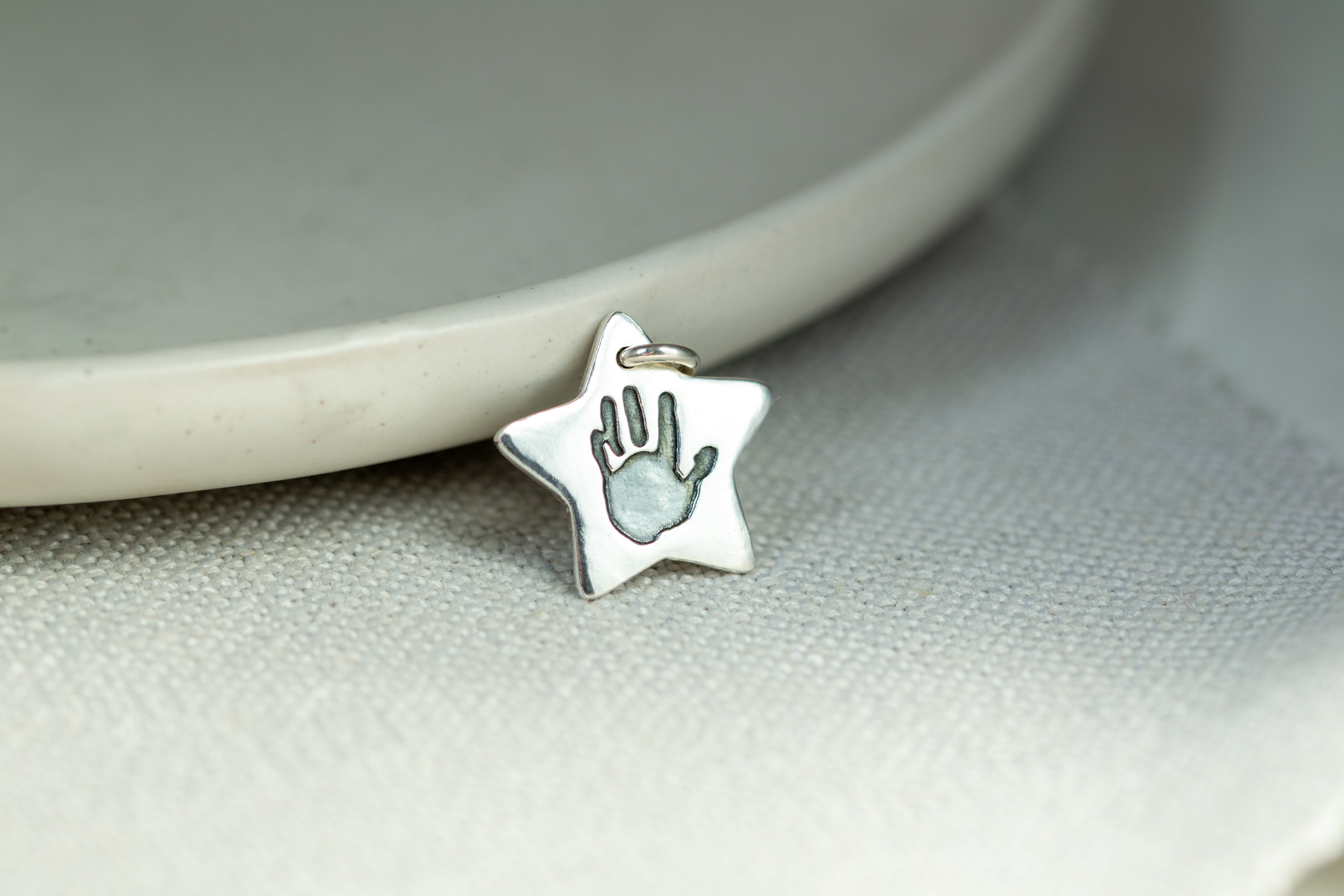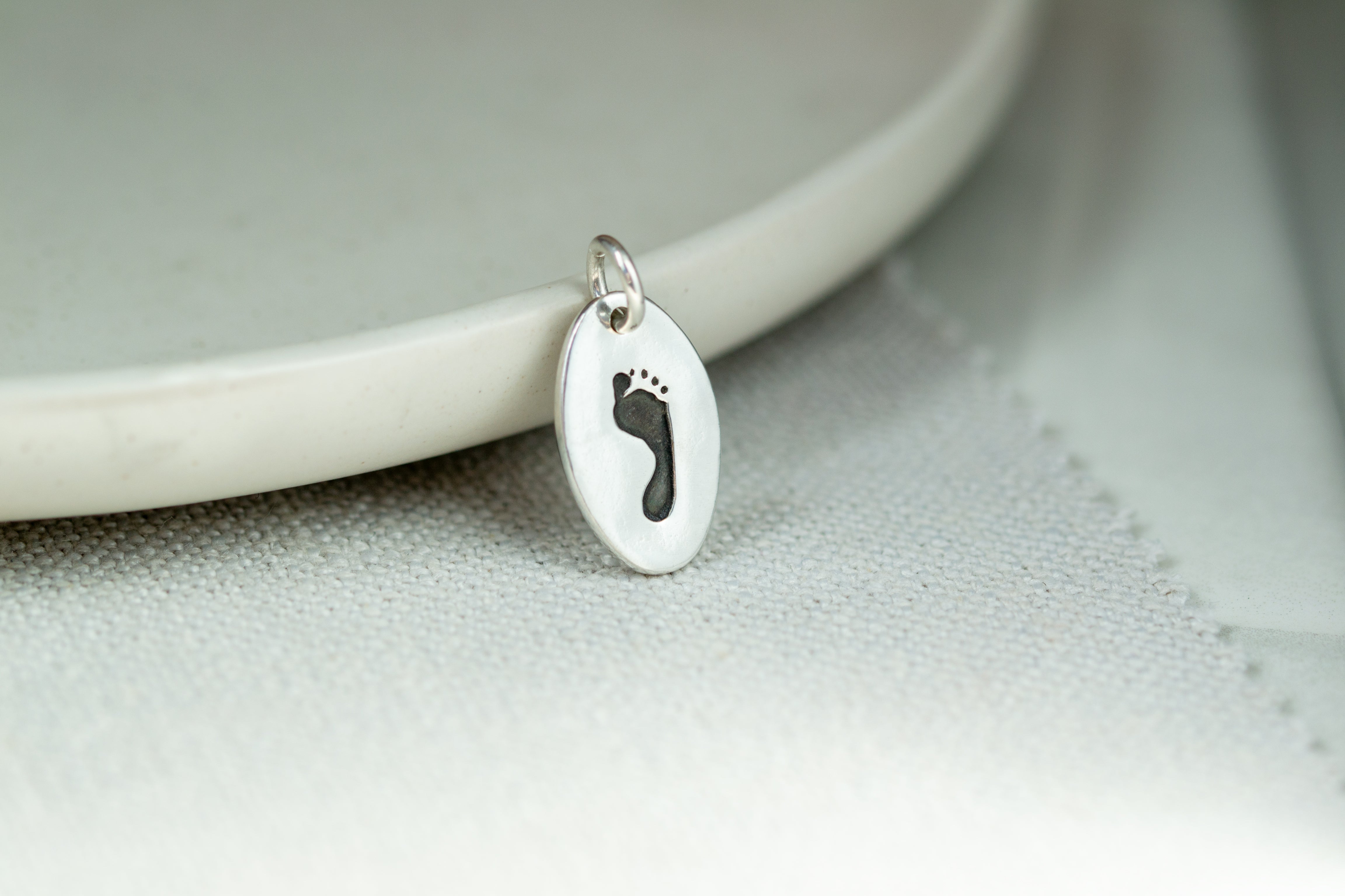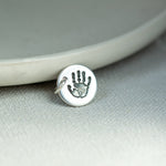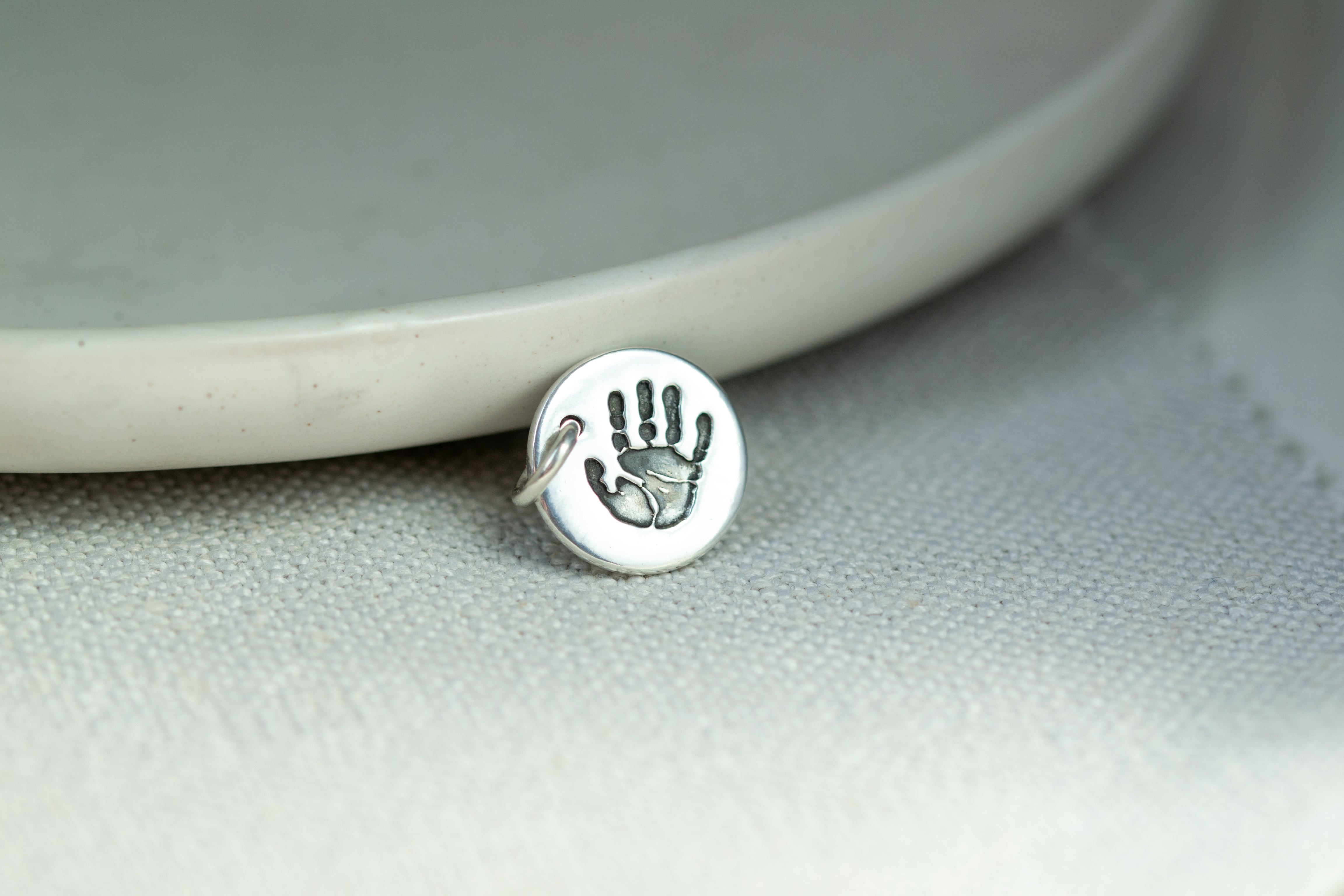 Перфектното допълнение към вашата колекция чар! Един от най-популярните ни артикули...прост сребърен талисман, изобразяващ отпечатък от ръка или крак от едната страна, с име и възраст, гравирани на обратната страна. Всеки талисман е ръчно изработен и се предлага на сребърен скок, така че да може да се прикрепи към съществуваща гривна или огърлица. Направете ясна снимка на съществуващ печат или глинена отливка и я качете с поръчката си. Или включете един от нашите комплекти за ръце и отпечатъци без мастило, за да получите оригинален отпечатък. Изберете от различни форми на талисмани... Вашият готов артикул ще бъде доставен, красиво опакован, допълнен с кърпа за полиране и съвети за грижа.