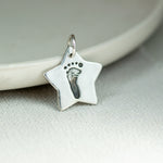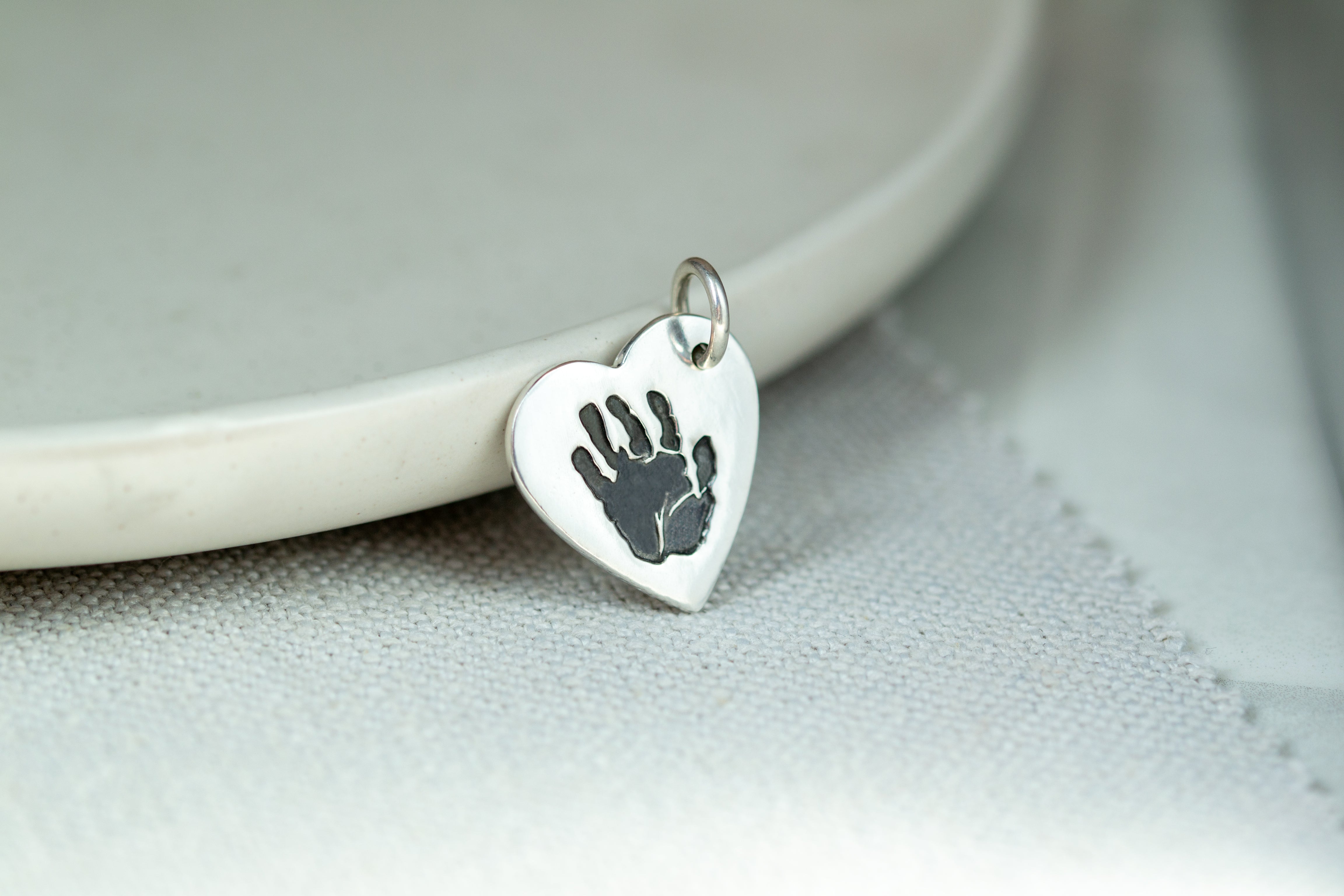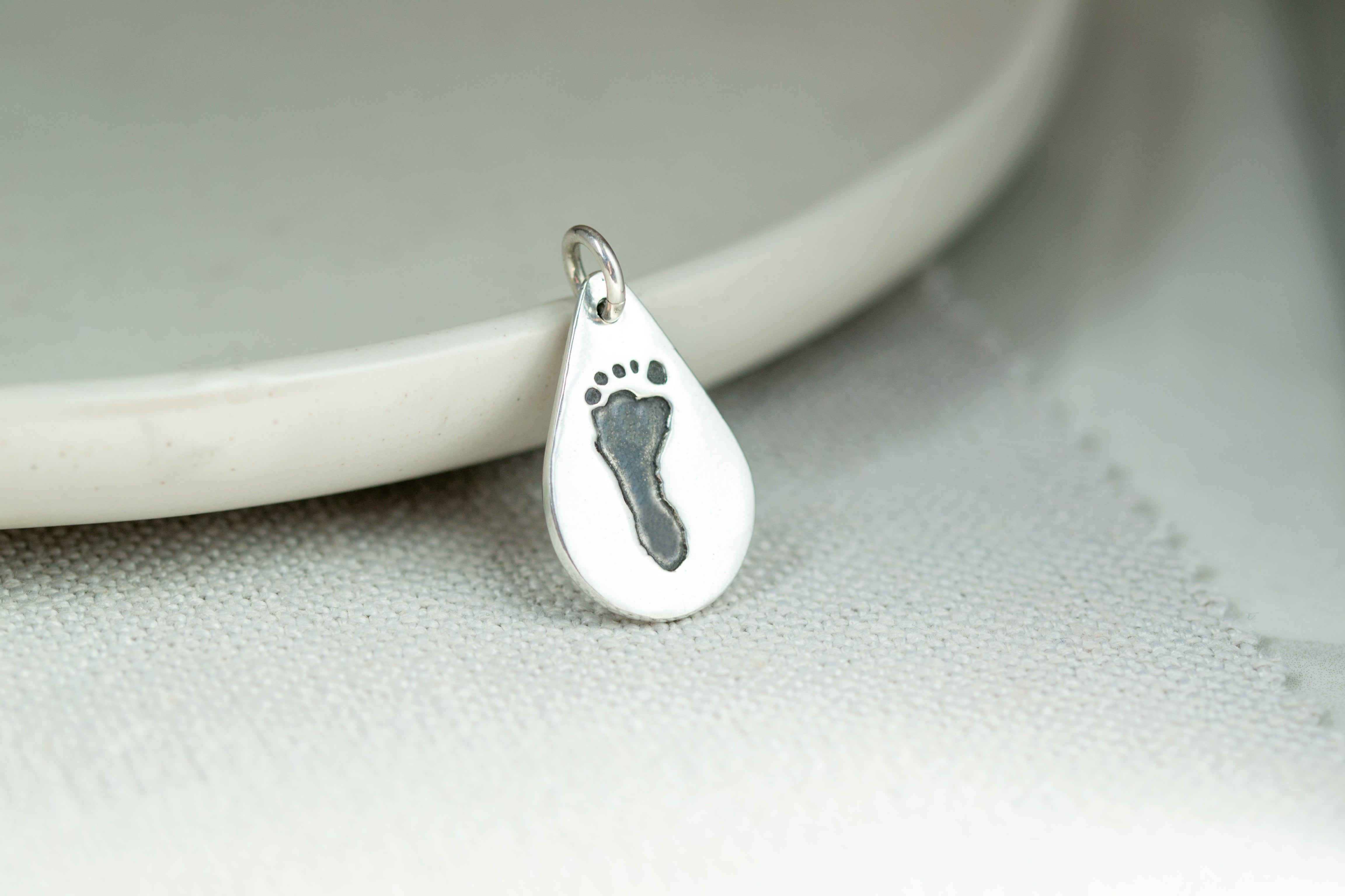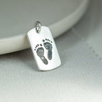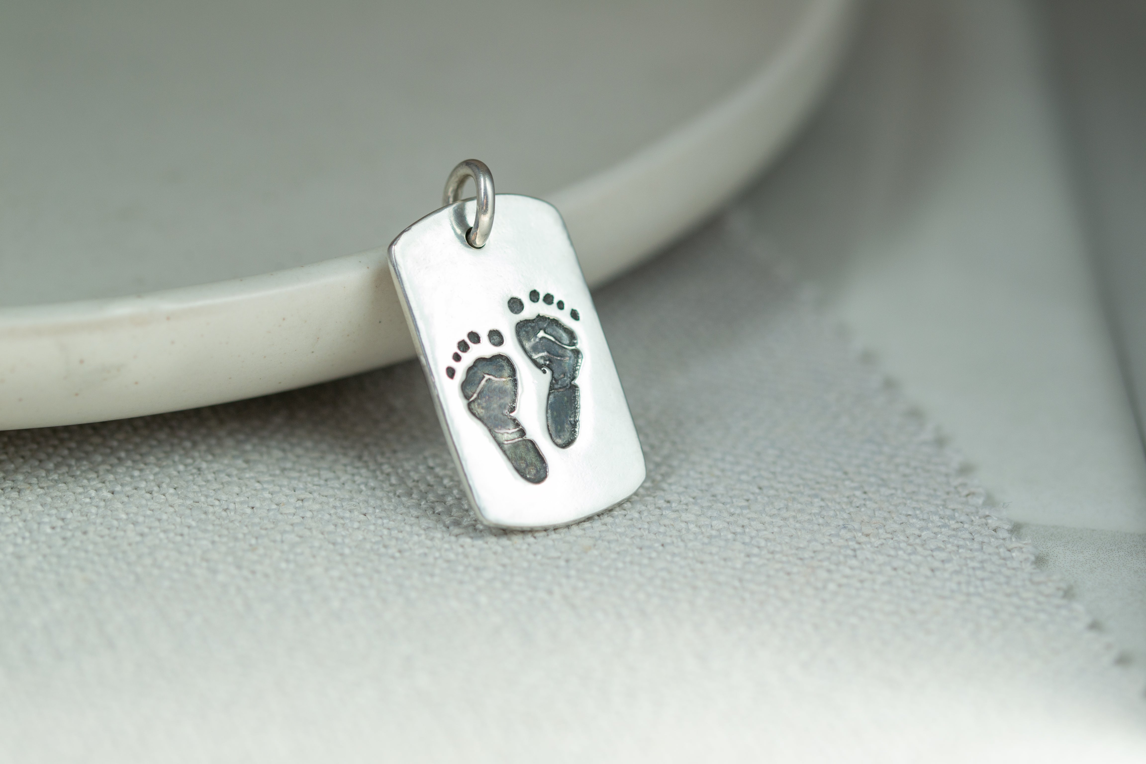 Уловете момента от деня на раждането на бебето! Изключително популярен артикул... висулка от чисто сребро, носеща отпечатък от ръка или крак заедно с ръчно гравирани име и възраст на гърба. Всеки медальон идва върху сребърен пръстен за скок, така че да може да се прикрепи към съществуващо колие (или можете да изберете от нашата колекция). Направете ясна снимка на съществуващ печат или глинена отливка и я качете с поръчката си. Или включете един от нашите комплекти за ръце и отпечатъци без мастило, за да получите оригинален отпечатък. Изберете от различни форми на висулки... табелката за куче е идеалният подарък "за него". Вашият готов артикул ще бъде доставен, красиво опакован, допълнен с полираща кърпа и съвети за грижа.