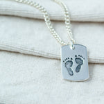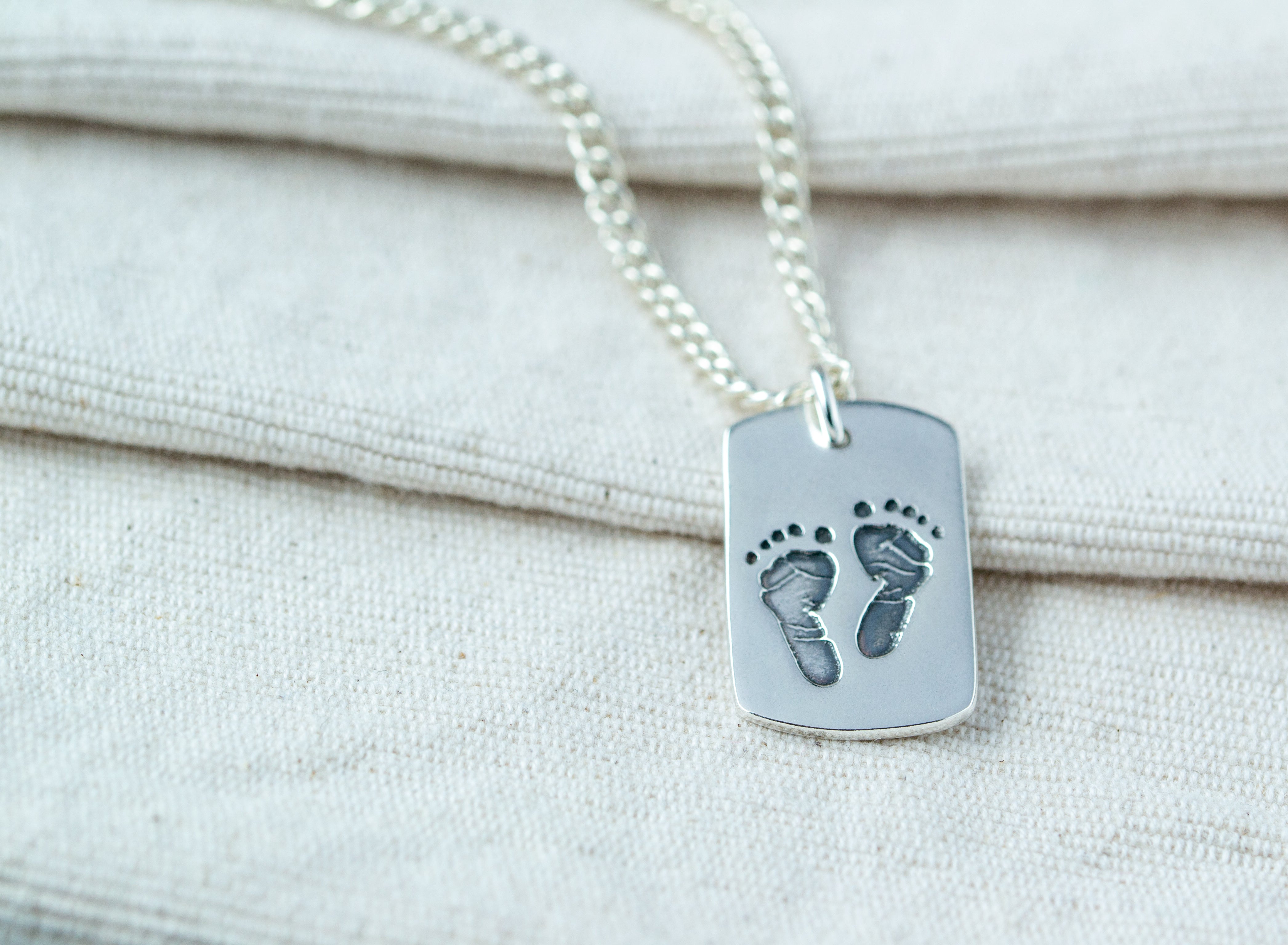 Предпочитате ли по-дълга, елегантна верижка, за да покажете тези малки пръстчета на ръцете и краката? Уловете момента от деня на раждането на бебето! Висулка от чисто сребро, носеща отпечатък от ръка или крак заедно с ръчно гравирани име и възраст. Направете ясна снимка на съществуващ печат или глинена отливка и я качете с поръчката си. Или включете един от нашите комплекти за ръце и отпечатъци без мастило, за да получите оригинален отпечатък. Изберете от различни форми на висулки. След това допълнете артикула си с една от нашите италиански тънки сребърни бордюрни верижки (с два варианта за размер). И накрая, имате възможност да включите родния камък по ваш избор. Перфектно!