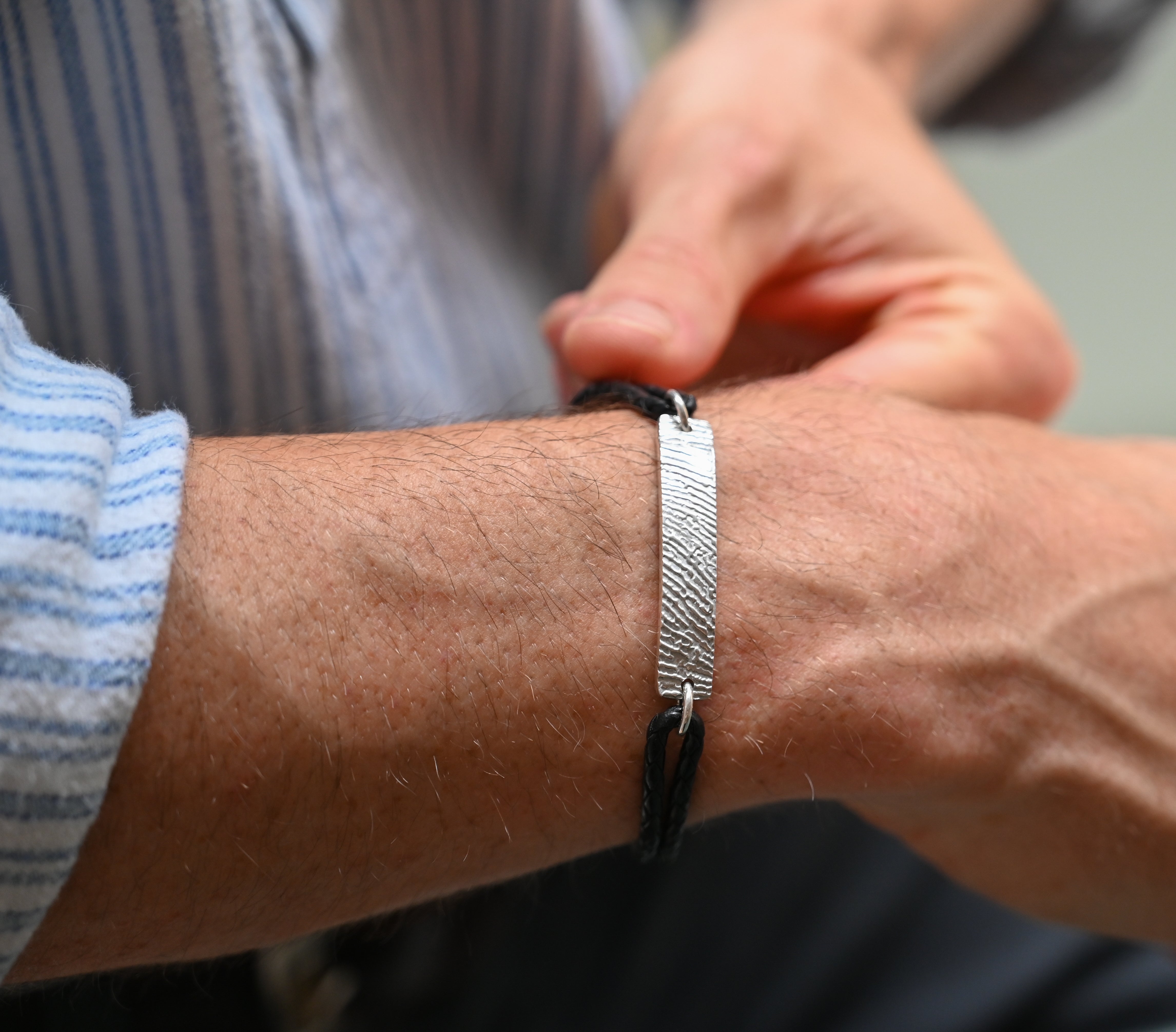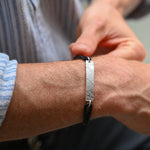Carry your loved ones with you wherever you go with our new Bar Bracelet. Featuring the texture of your loved ones fingerprint on a beautiful sterling silver bar, a truly meaningful and personal touch. Crafted from premium leather and designed for everyday wear, this piece combines rugged style with heartfelt sentiment. For an added layer of personalisation, the reverse of the bar can be engraved with a name, date, or short message.