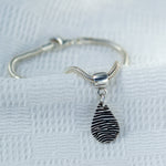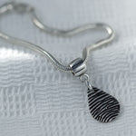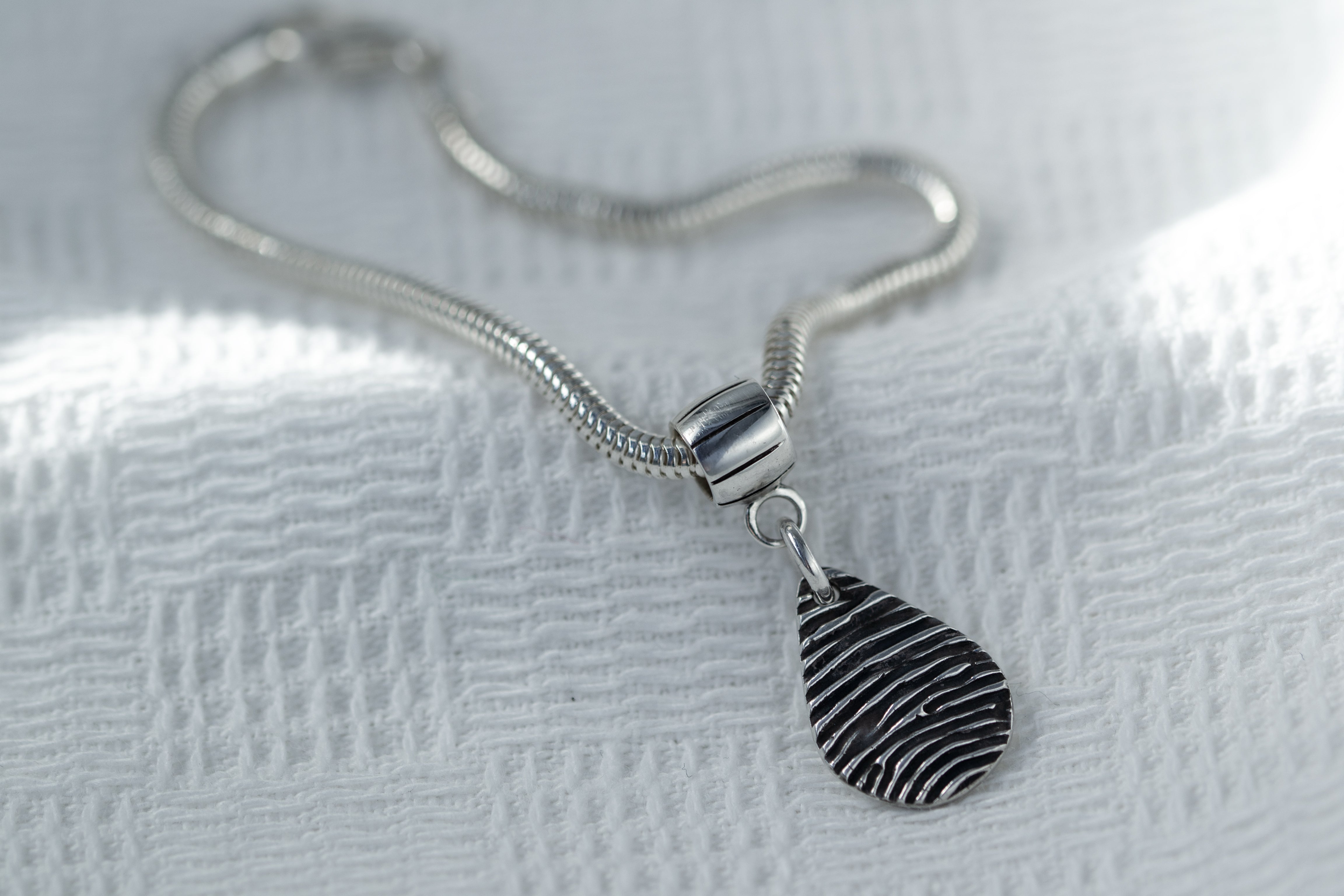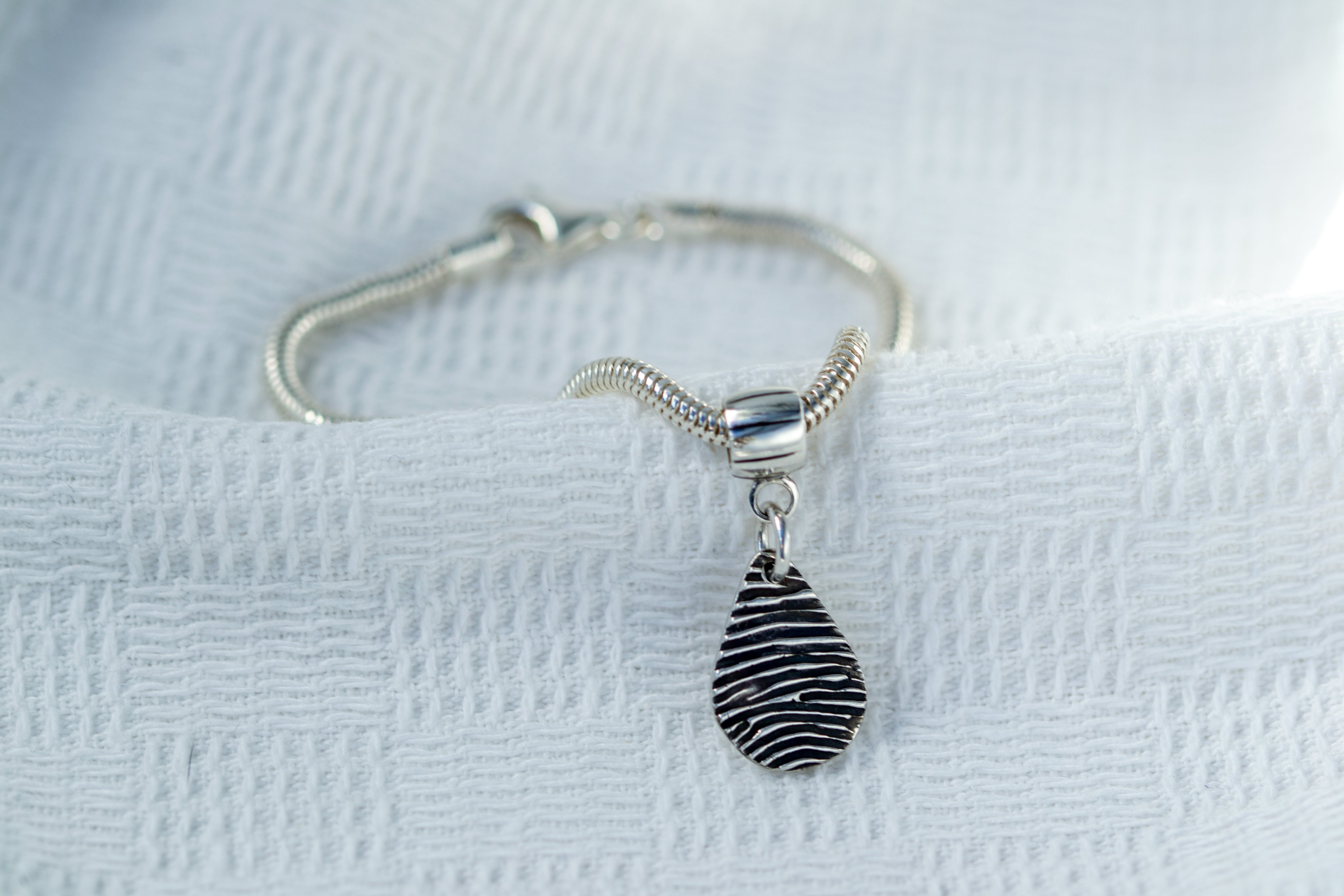 Уловете текстурата на пръстов отпечатък върху талисман от чисто сребро, след което го покажете върху копринена гривна със змийска верига. Вашият талисман се прикрепя към гривната с носач от чисто сребро, който също е съвместим с Pandora. Ако вече имате пръстов отпечатък с мастило, просто го качете с поръчката си. Ако не, добавете комплект за пръстови отпечатъци с мастило. Изберете от различни форми на талисман, като същевременно имате опция за гравиране на име и възраст на гърба. Всичко включено в цената!