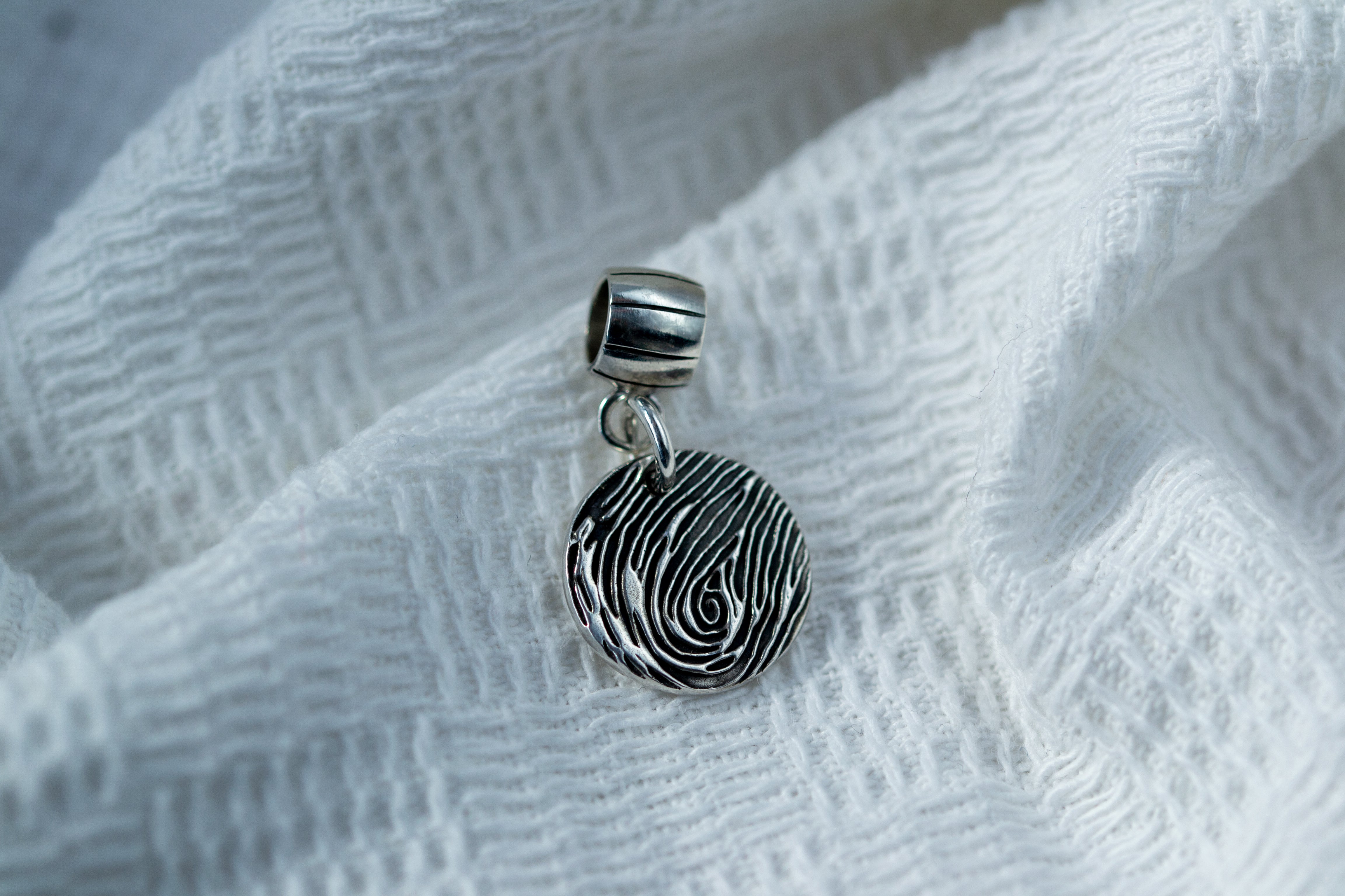 Място за още един талисман на вашата гривна Pandora? Защо не го направите нещо наистина лично. Уловете текстурата на пръстов отпечатък върху талисман от чисто сребро, придружен от съвместим с Pandora носител. Ако вече имате пръстов отпечатък с мастило, просто го качете с поръчката си. Ако не, добавете комплект за пръстови отпечатъци с мастило. Изберете от различни форми на талисман, като същевременно имате опция за гравиране на име и възраст на гърба. Всичко включено в цената!