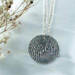 Предпочитате ли по-дълга, елегантна верига, за да покажете уникалния си спомен? Почувствайте текстурата на истински пръстов отпечатък, украсен върху висулка от чисто сребро. И не е само за отпечатъка на вашето дете...това е прекрасна възможност да държите пораснал любим човек близо до себе си. Ако имате съществуващ печат с мастило, просто го качете с поръчката си. В противен случай включете един от нашите комплекти за печат с мастило и ни изпратете вашия печат по-късно. Изберете от различни форми, с име и възраст, гравирани върху всяко парче. След това допълнете артикула си с една от нашите италиански тънки сребърни бордюрни верижки (с два варианта за размер). И накрая, имате възможност да включите родния камък по ваш избор. Перфектно!