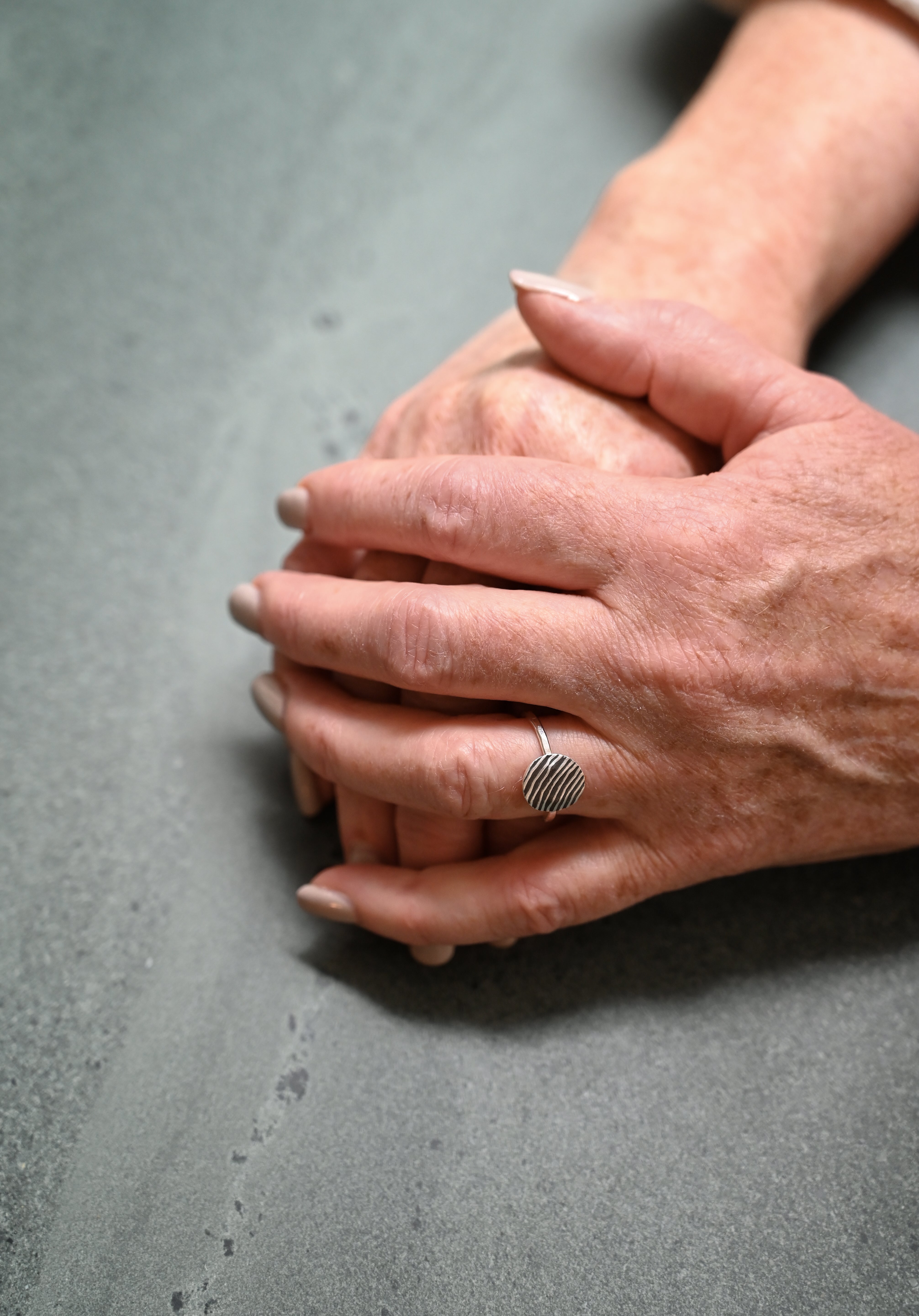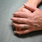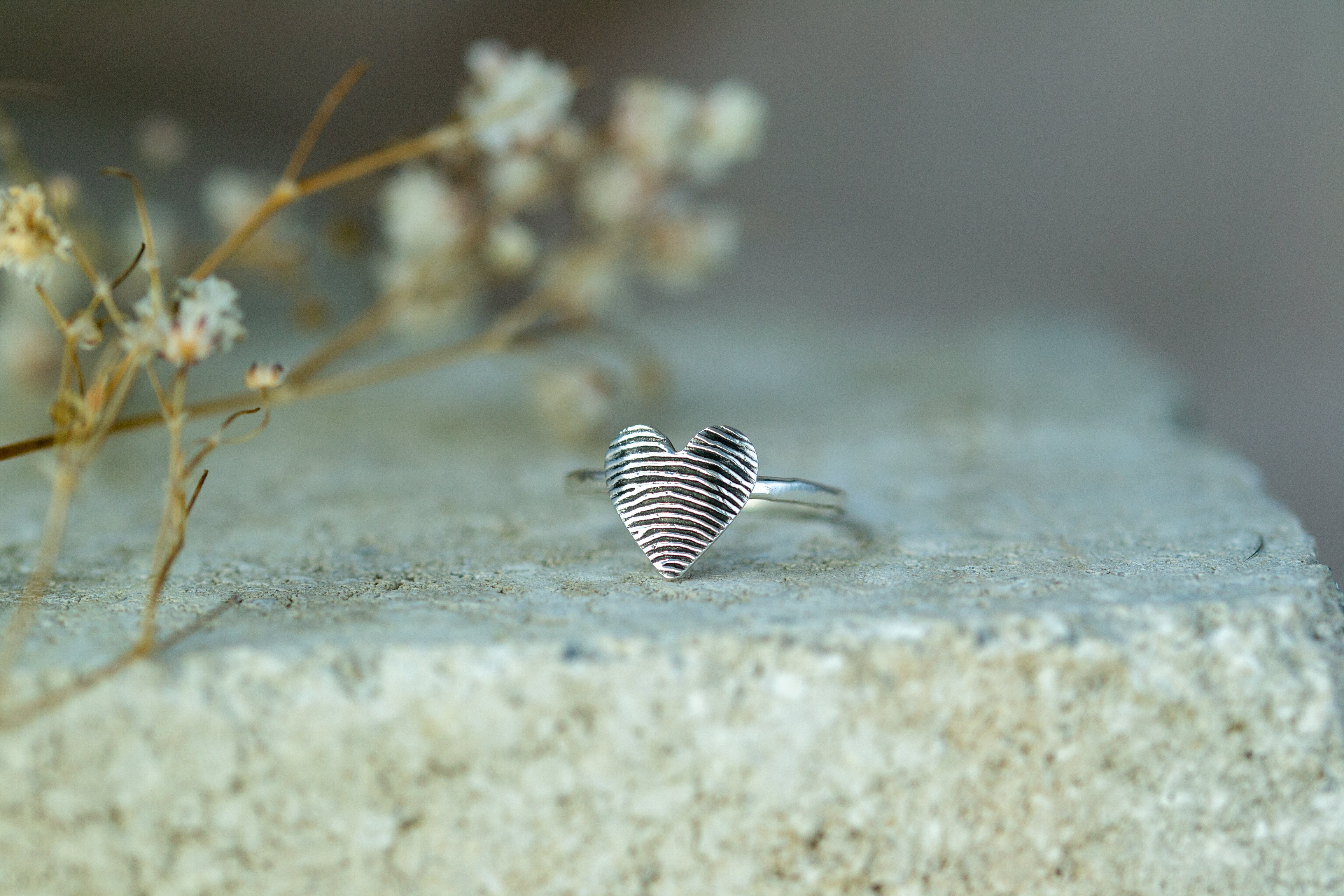 This dainty fingerprint ring offers a subtle, personal way to carry the memory of a loved one with you. Crafted in sterling silver, the band features the fingerprint whorls of your loved one on a hammered silver band. Thoughtfully designed for those who appreciate both sentiment and style. Available in all sizes and in a circle or heart shape. A beautiful tribute and daily reminder of someone special.